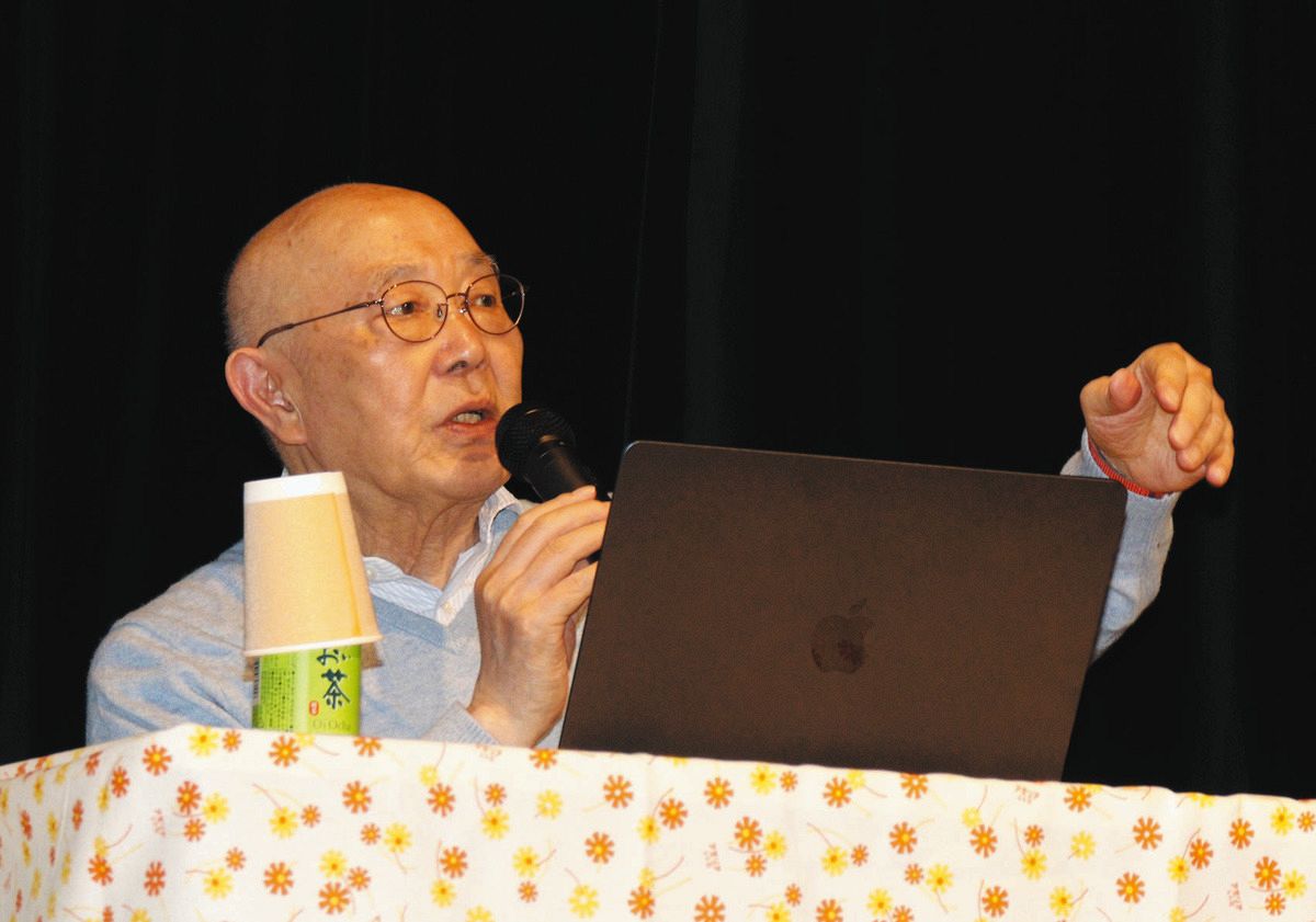飼い猫の幻視を見た時の驚きを講演で語る三橋昭さん=横浜市西区で