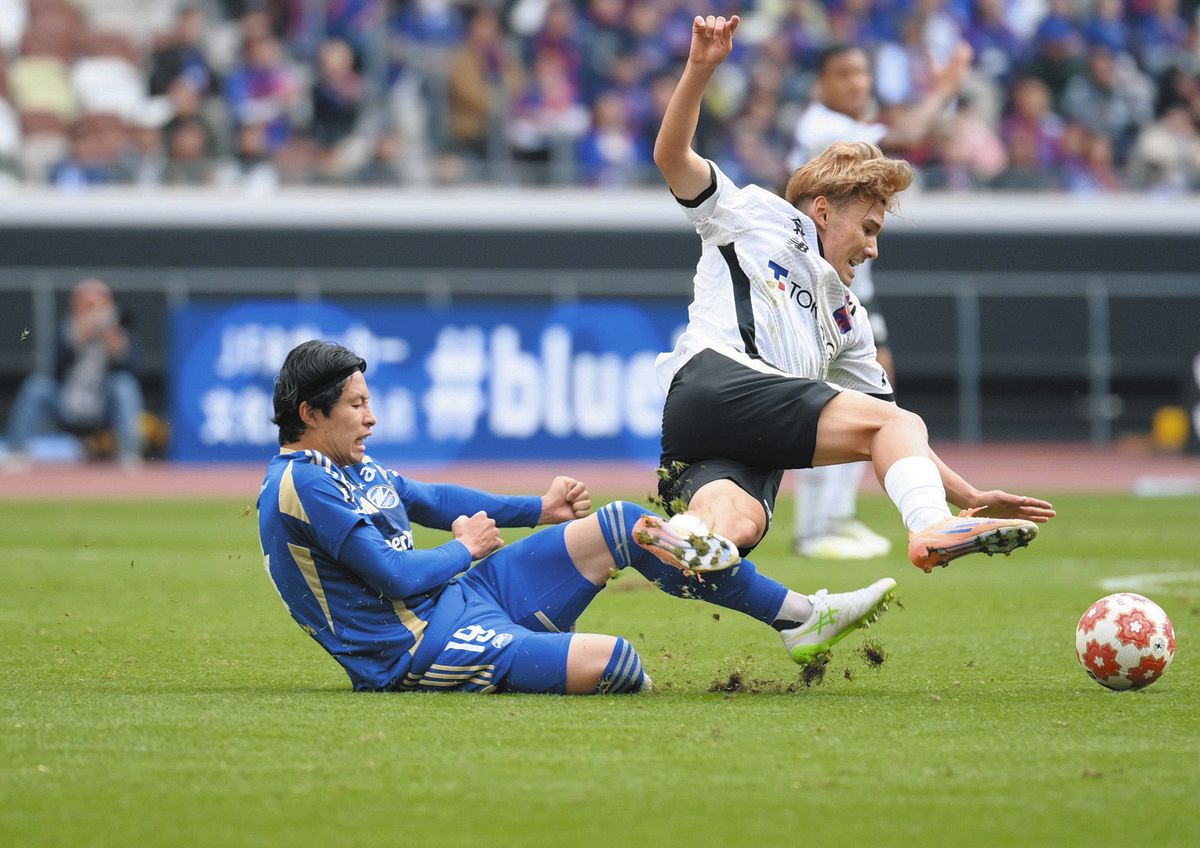 町田ーFC東京後半、FC東京・佐藤(右)と競り合う町田・中山=16日、国立競技場で(芹沢純生撮影)