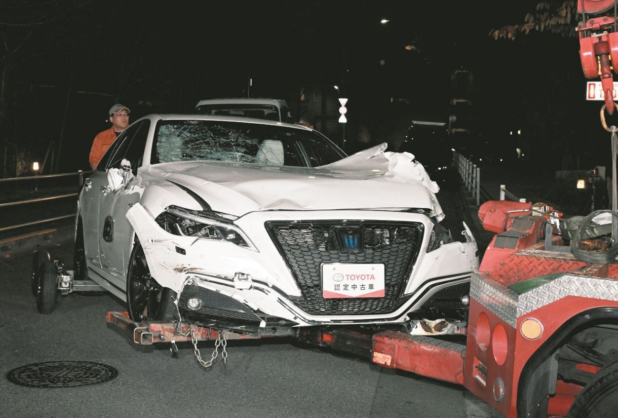 11月24日17時すぎ、警視庁西新井署へ入る、事故を起こしたと見られる乗用車=東京都足立区で(芹沢純生撮影)
