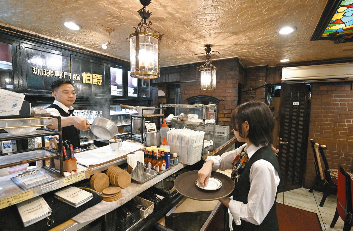 朝の光が差し込む店内に、オルゴールのやさしい音色が流れる。池袋駅北口を出てすぐの「珈琲(コーヒー)専門館伯爵池袋北口店」(豊島区)はシャンデリアやステンドグラス、赤いベルベットの椅子が並ぶ純喫茶だ。朝一番で訪れた男性常連客(58)は「ゆったりとした雰囲気がいい」と話す。
