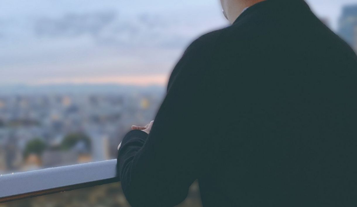 夕暮れ時、自宅マンションのベランダから街を見下ろす李さん(一部画像処理しています)