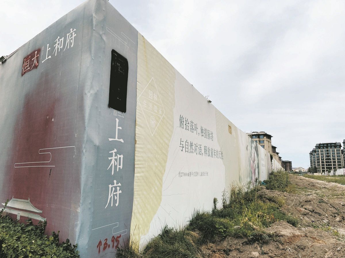 中国の不動産大手「恒大集団」が開発した北京郊外の住宅展示場。経営危機に陥り、「恒大」の名前が黒く塗りつぶされた看板=2023年9月(白山泉撮影)
