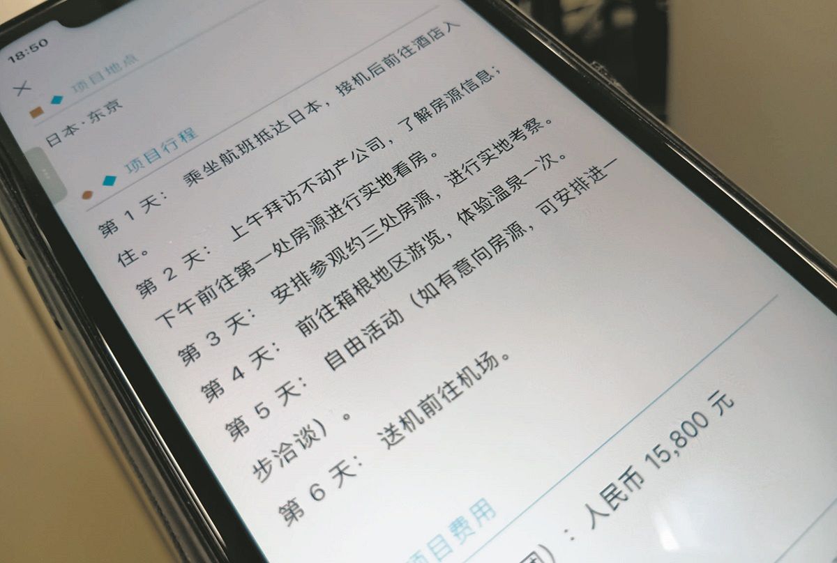 募集しているツアーの一つは、北京発で、都内の不動産を数カ所見学した後、箱根を観光して温泉に入る5泊6日のツアー。1人あたり15800元(約34万円)だった。