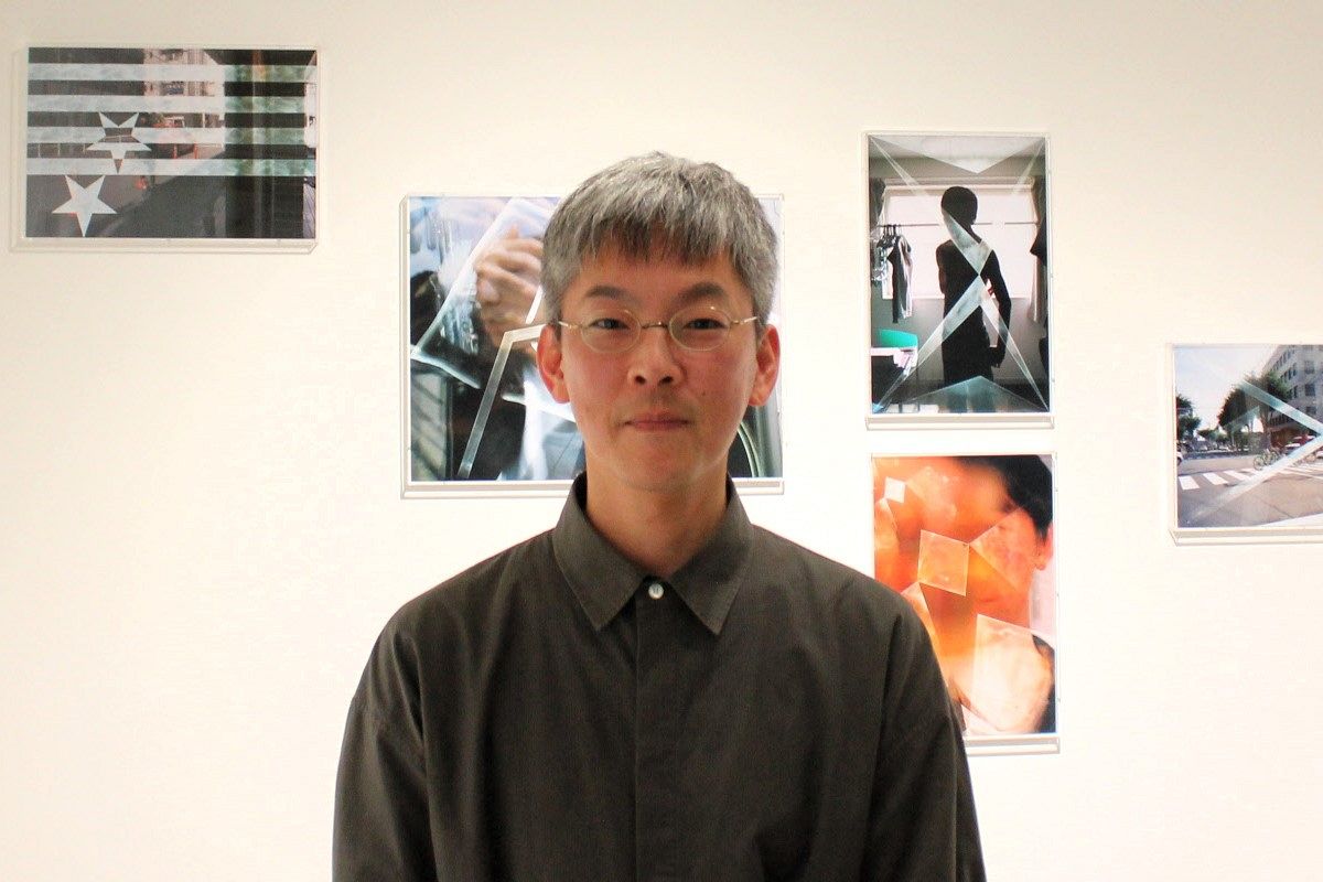 自転車に乗った少年たちが横断歩道を走る瞬間を捉えた作品は、数年前に帰省した金沢市内で母親の運転する車が停車した際に助手席から撮った。その写真に三色旗をイメージした図形を重ねることで、少年たち、撮影する森さん、森さんを見る母親という3者のまなざしを強調したという。