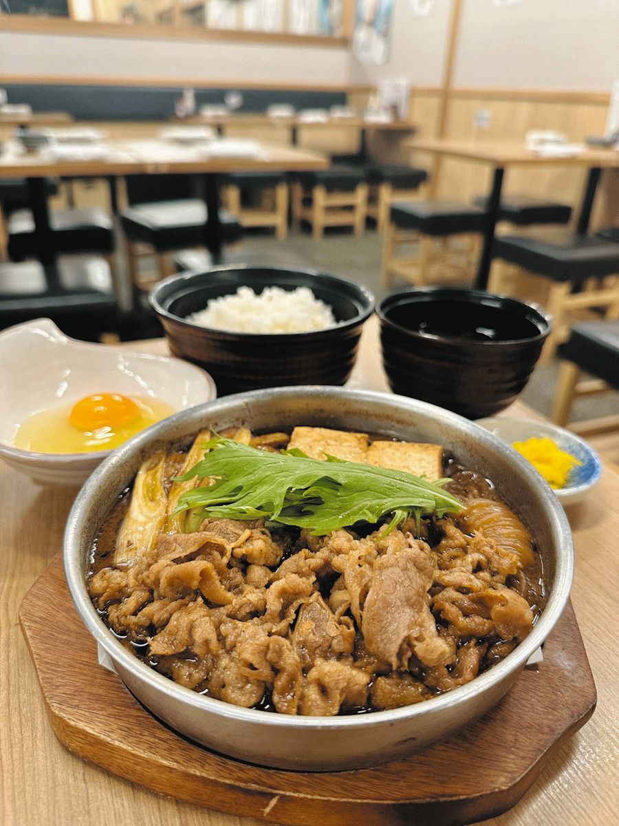 お目当ては「牛すき焼き定食」。同(下)=のセットで千円ジャスト。牛バラ肉、豆腐、シラタキ、長ネギ、タマネギ、ゴボウ、水菜、うどん入りで具材も十分。