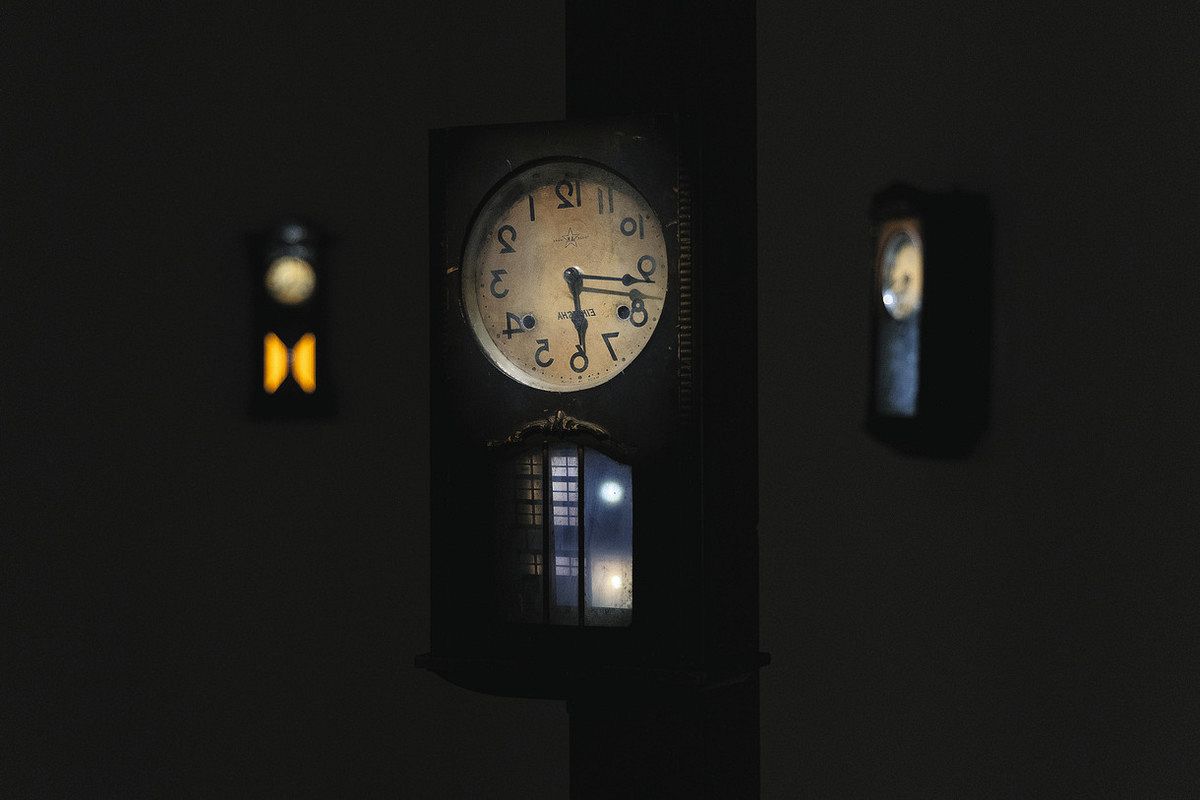 岡ともみは、映像を用いた舞台やインスタレーションなど、多様なかたちで表現を行ってきた。本展出品シリーズ作<サカサゴト>は、時計の針や盤面が反転している古い柱時計の中に「葬送」にまつわる風習をもとに制作された映像を封じた作品である。