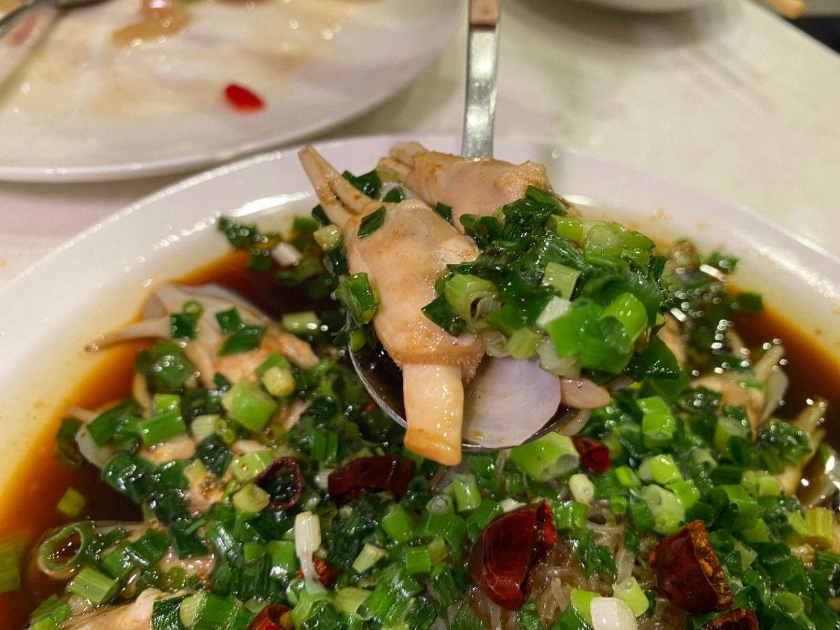 これを殻ごと蒸して、大輪の花のような形に並べる。中心には春雨。酢と醤油、こしょう、砂糖を混ぜたタレを上からたっぷりかけ、青ネギを乗せて完成。見た目はややグロテスクだが、色彩が豊かな料理だ。