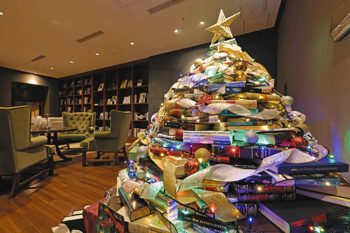 星やリボンで飾り付けされたクリスマスツリーが美しい。この時季らしい、赤、白、緑のきらびやかな光景に心が華やぐが、よく見ると、何かが違う。そう。これは本を積み上げて作ったもの。芝パークホテル名物の「ブックツリー」である。