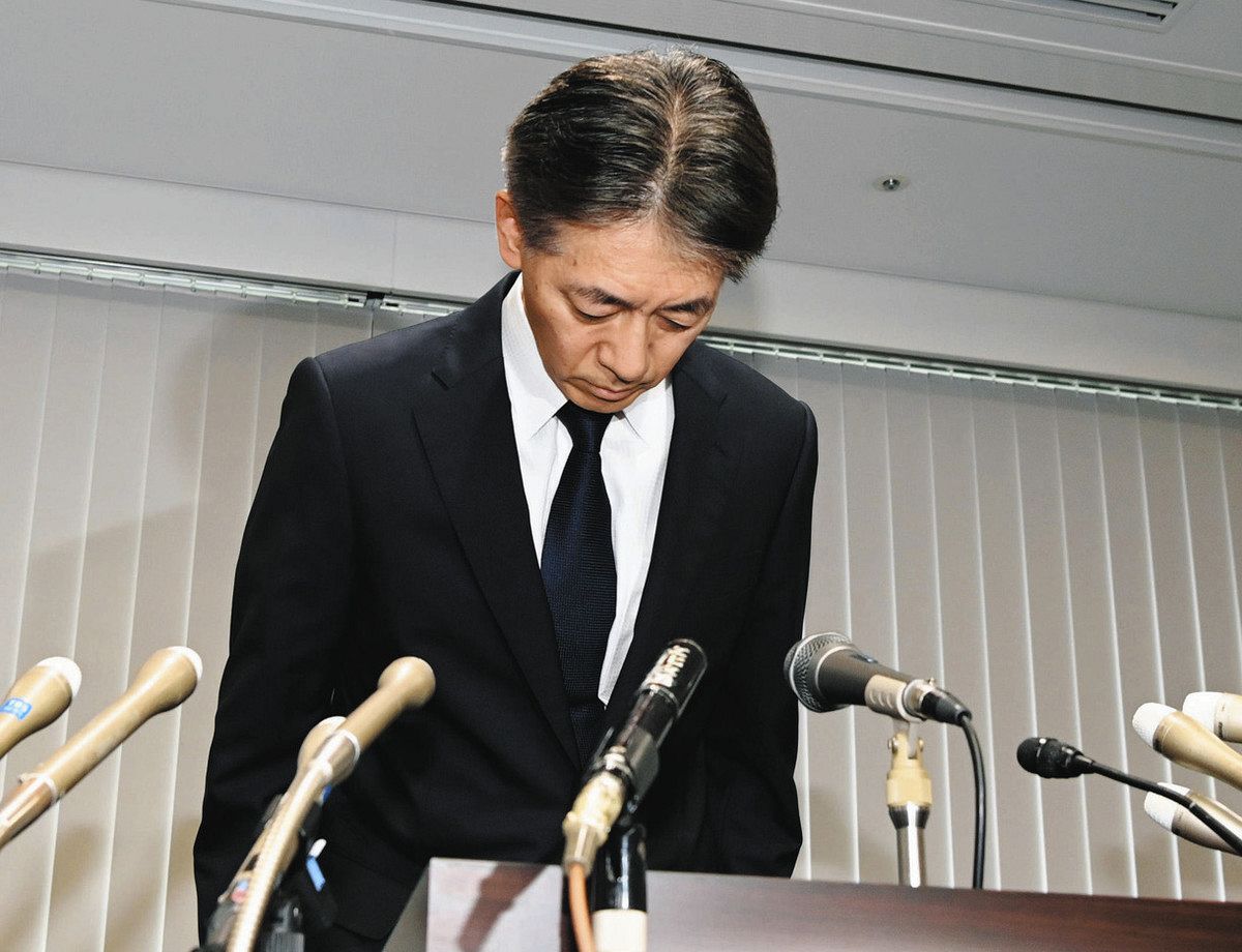 記者会見で頭を下げる迫田裕治警視総監=8月、警視庁で