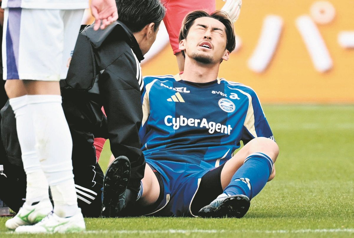町田ー広島後半、負傷し表情をゆがめるFC町田ゼルビアの菊池流帆=2月16日、町田GIONスタジアムで(芹沢純生撮影)