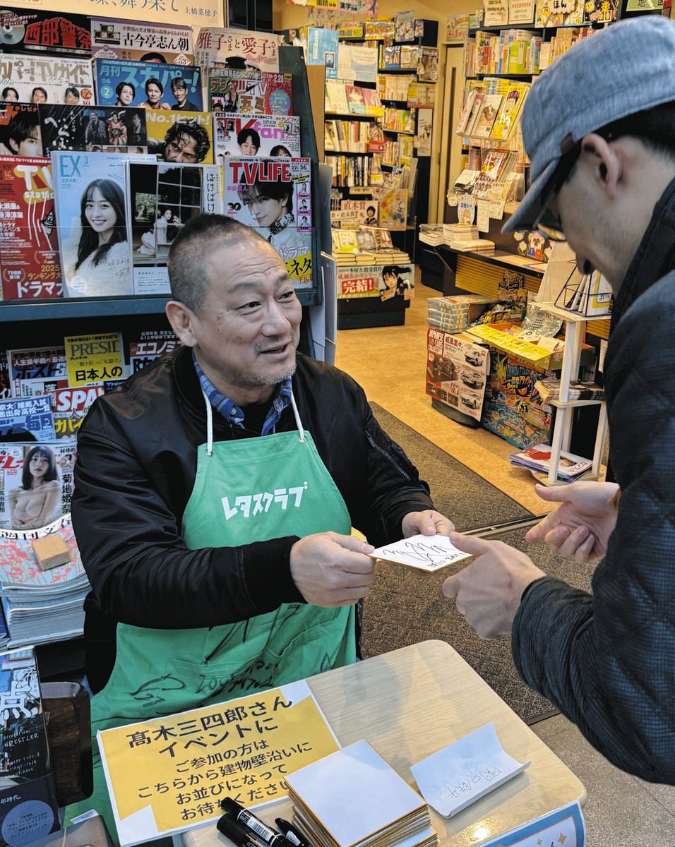 伊野尾書店の閉店を聞き、店でサイン会を開いたDDTプロレスリングの高木三四郎さん。DDTが売りにする「路上プロレス」は「本屋プロレスが原点になった」という=東京都新宿区で(佐藤航撮影)