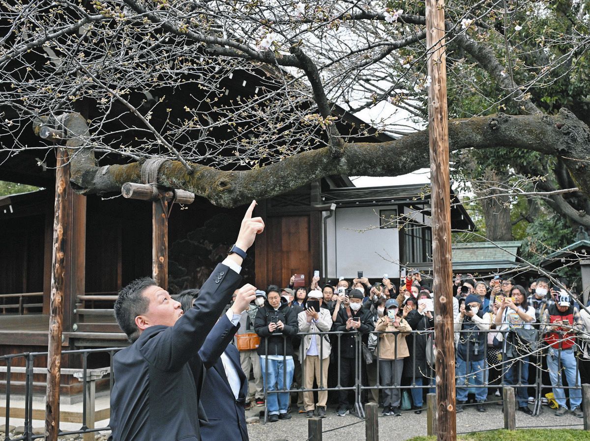 この日、都心の気温は19.8度まで上がり、4月中旬ごろの暖かさ。午後2時ごろ、東京管区気象台の職員が靖国神社(千代田区)境内の標本木(ひょうほんぼく)で「花が5~6輪以上咲いた状態」という開花の目安を満たしたことを目視で確認した。