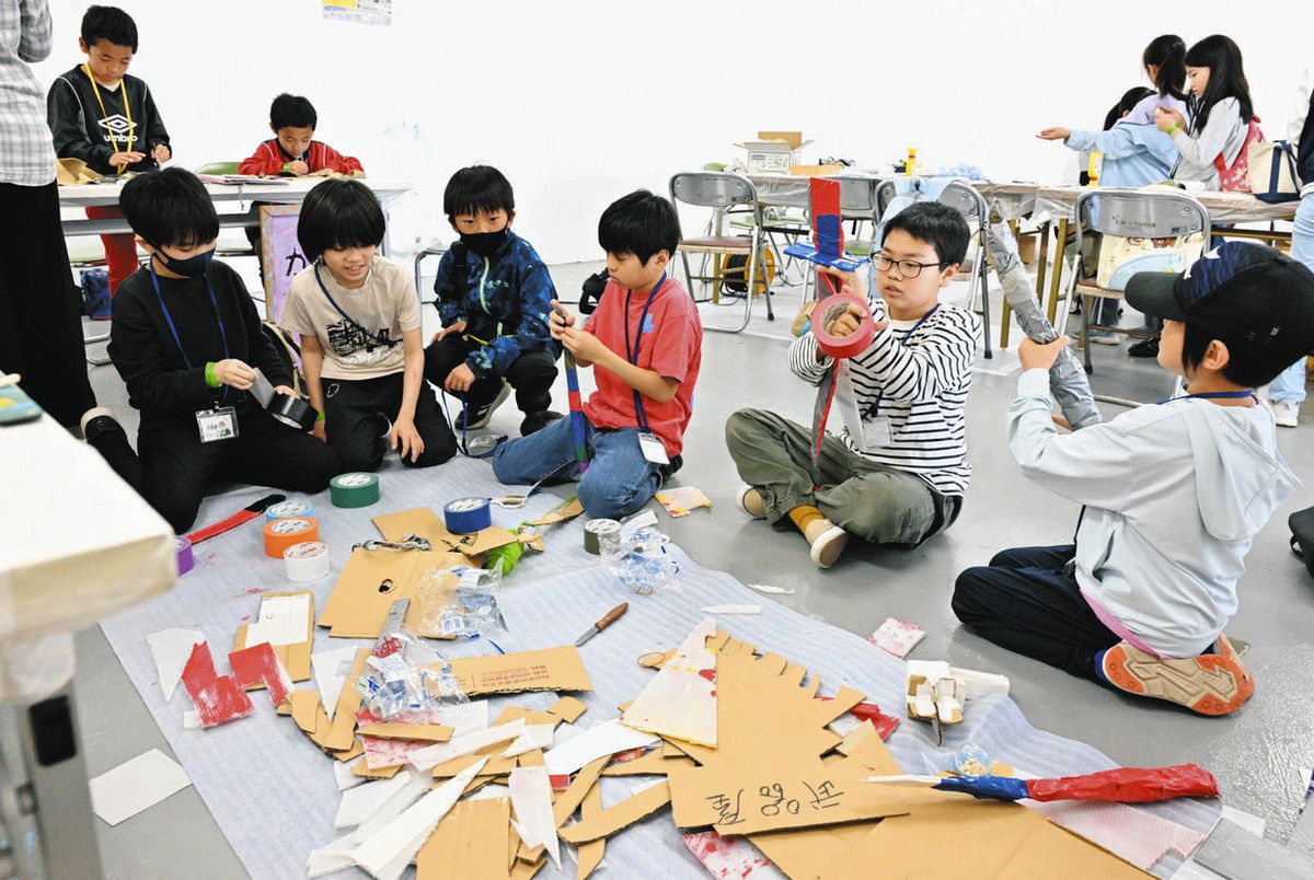 男の子たちには武器屋も人気の職業。昨年、武器を作る子どもたち=いずれも豊島区で