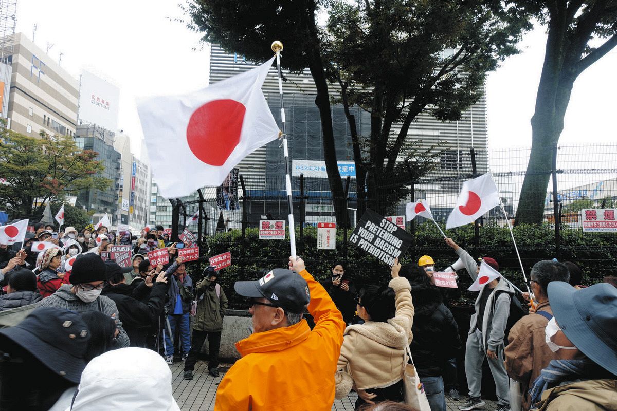 移民政策反対を訴えるデモで参加者によって振られる日の丸=昨年10月26日、東京・新宿駅前で
