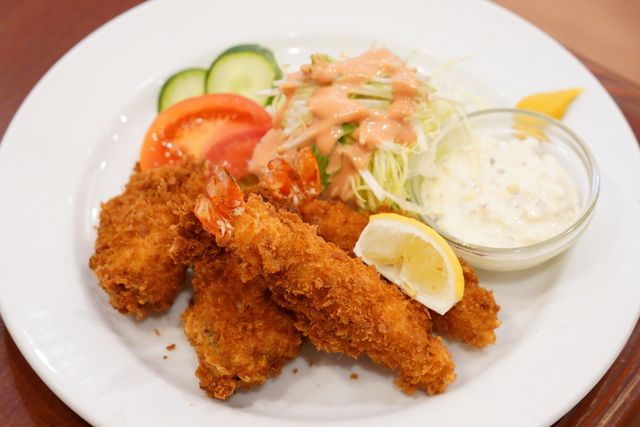 吊るし看板でおすすめしていた旬の味覚「エビフライ&カキフライ」(1180円)。季節限定のためじき販売終了。